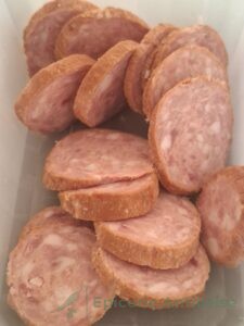 • Pendant ce temps, couper le saucisson à l'ail en rondelles.