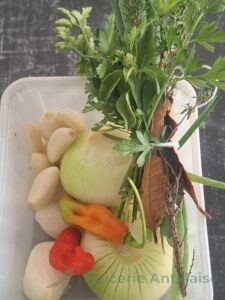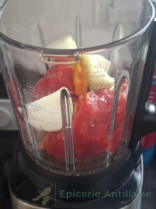 • Dans un mixer, ajouter les 2 tomates, un oignon, un peu de sel, et un piment végétarien.